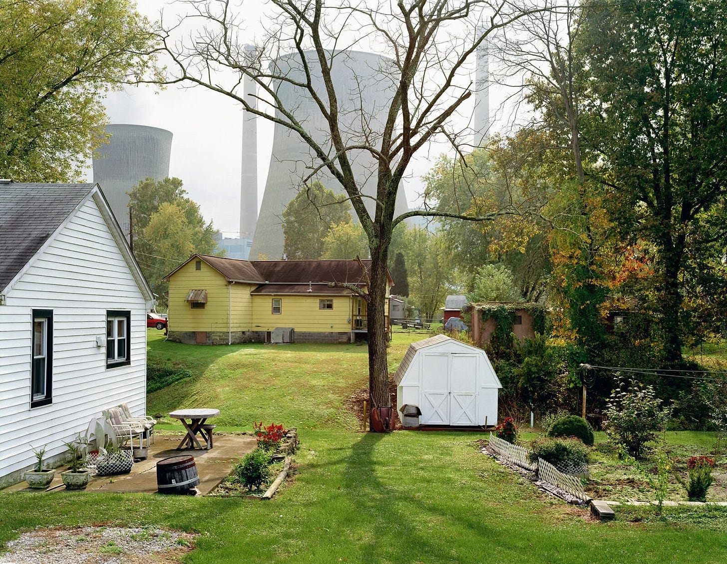 In another photograph, modest homes sit in the shadow of those same cooling towers, their backyard gardens and white picket fences dwarfed by monumental concrete forms. Epstein isn’t lecturing the viewer; he’s demonstrating how progress becomes embedded in everyday life. The scene feels almost ordinary—until you realize how small human presence becomes beside such engineered power.