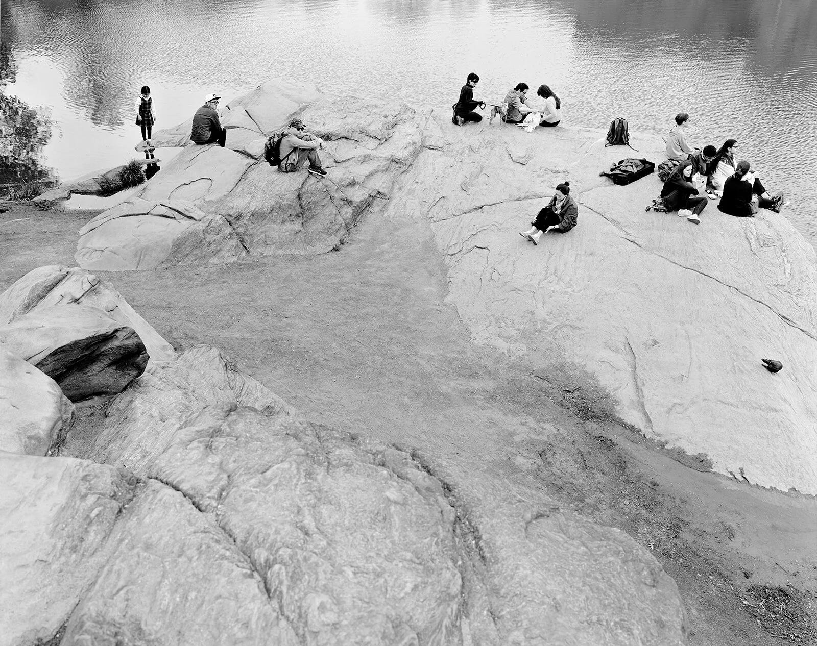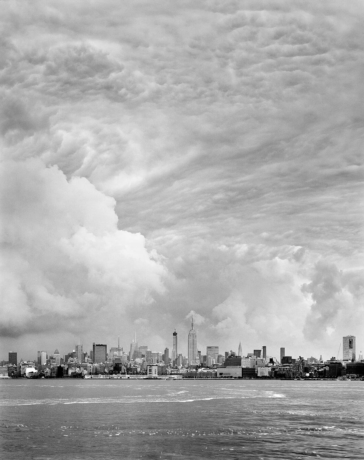When Epstein turns his camera on cities, the results are no less profound. His black-and-white studies of New York’s parks and waterfronts—rocks, water, people scattered in quiet reflection—have a monumental calm. Even the city skyline, framed by massive clouds, feels less like an architectural statement and more like an ecosystem of human ambition. He sees geometry and rhythm in both nature and steel.