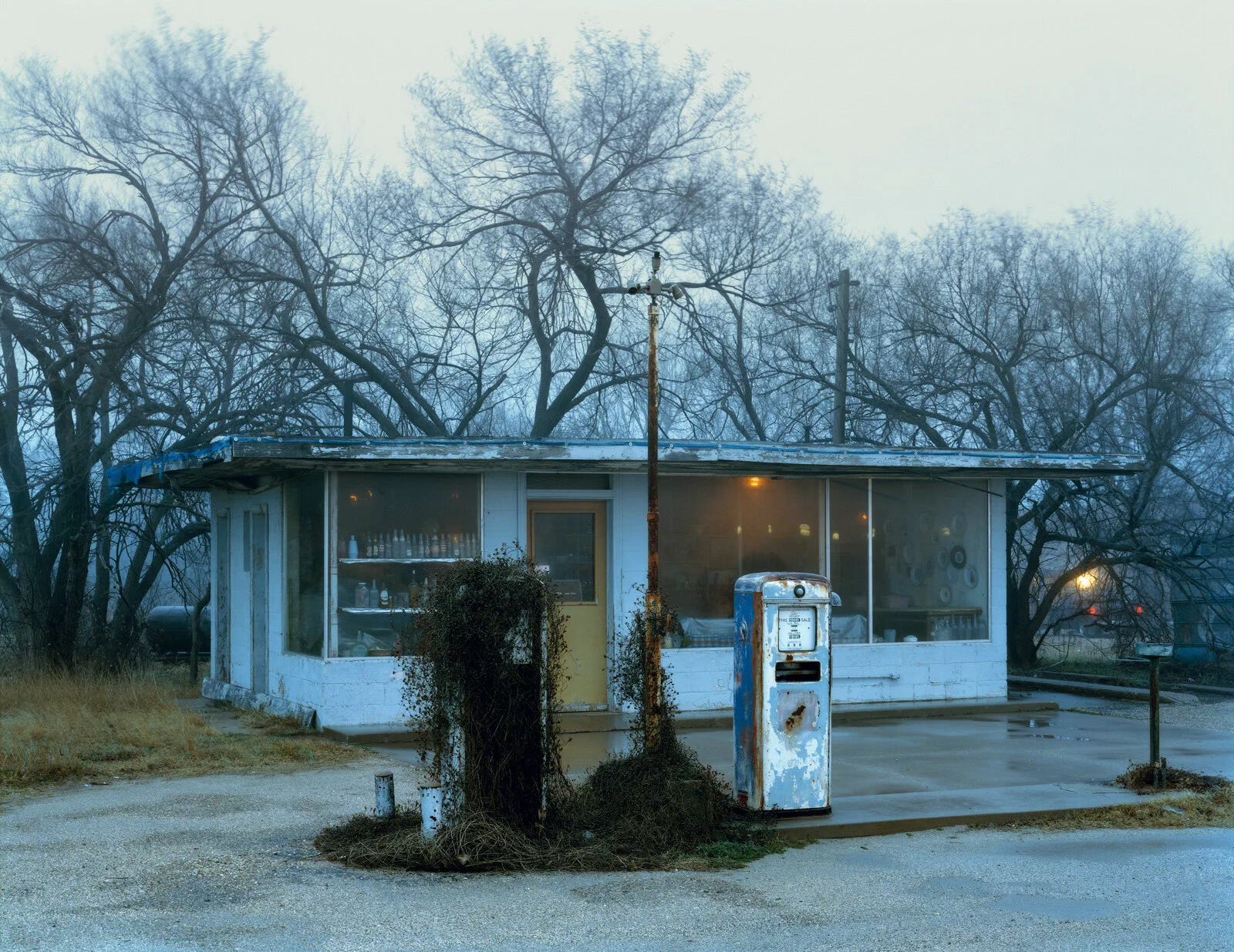 A few photographs later, we’re somewhere quieter: a lonely gas station enveloped in fog, its rusting pump standing like a relic of mid-century optimism. The image feels suspended in time—beautifully composed, yet haunted by a sense of abandonment.