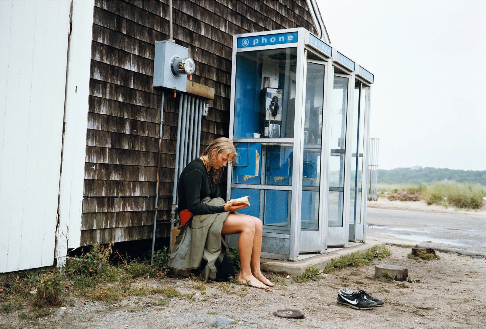Epstein’s work has always navigated a delicate balance between grandeur and intimacy. A woman sits near a weathered phone booth by the sea, reading a book. The air feels damp; her shoes are off; the world around her seems paused.
