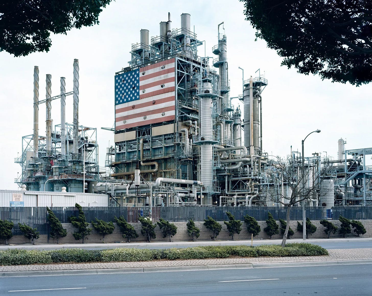 His view of America extends beyond West Virginia or the power grid. In a California image, a massive refinery dominates the horizon, adorned with an oversized American flag. It’s both patriotic and ironic—industry as national iconography.