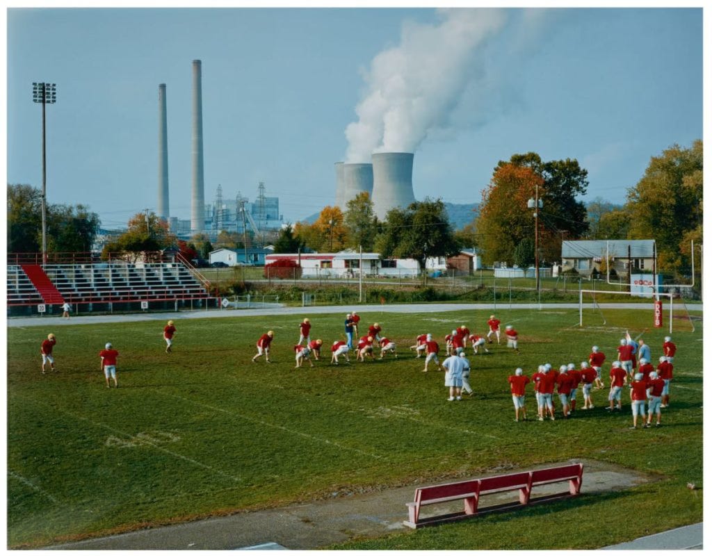 Many of Epstein’s photographs—both color and black-and-white—are striking not for what they dramatize, but for what they quietly observe. In one image, a group of high school football players runs drills on a muddy field while a coal power plant looms behind them, its smokestacks rising like sentinels of a different kind of endurance. The contrast between youthful energy and industrial might feels distinctly American—hope and consequence captured in a single frame.
